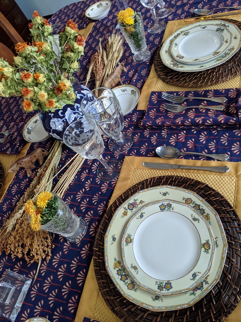 Textured Thanksgiving table with blue, white, and gold elementsUse vintage dishes safely